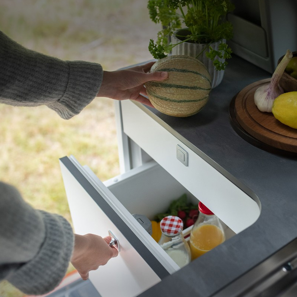 La cucina del nuovo Nugget è completamente attrezzata: piano cottura a gas a due fuochi, lavello, frigo a cassetto da 33L e dispense per stoviglie e alimenti. E ora anche con boiler acqua calda e fredda.