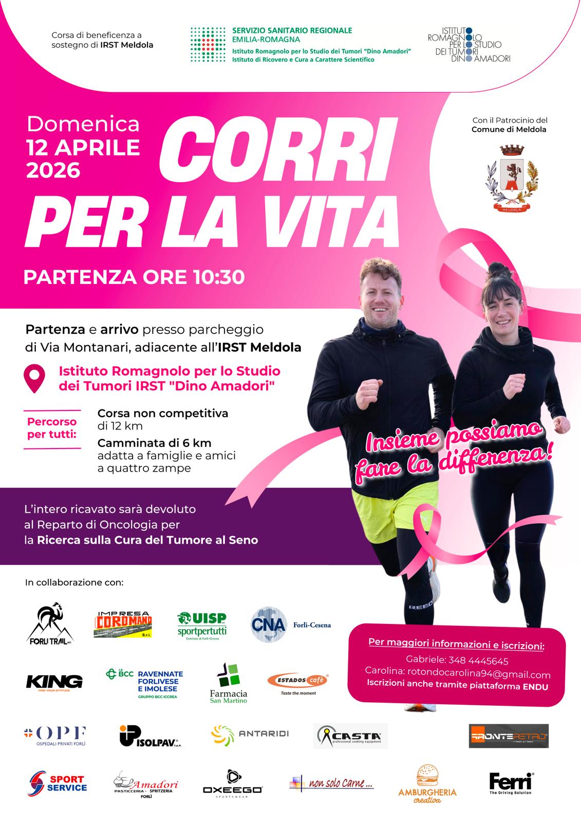 Nella mattina di domenica 12 aprile a Meldola si svolgerà “Corri per la vita”, manifestazione podistica non competitiva organizzata per raccogliere fondi a sostegno dell’Istituto Romagnolo per lo Studio dei Tumori “Dino Amadori IRST IRCCS e, in particolare, della ricerca per la cura del tumore al seno.