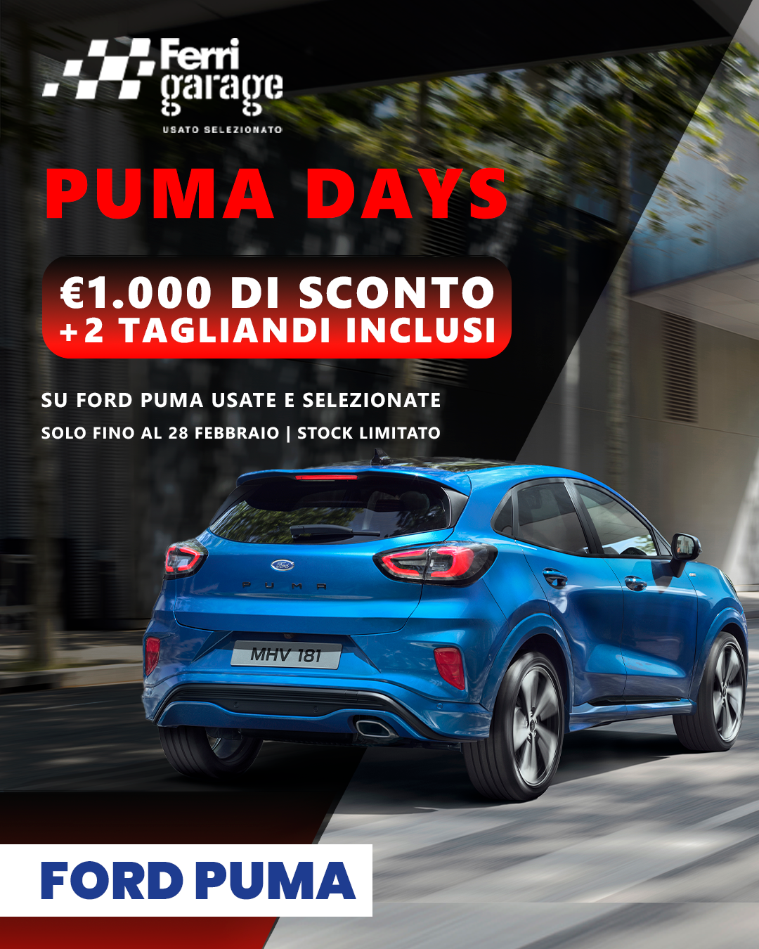 Febbraio è il mese giusto per salire a bordo della tua prossima auto. Con i Puma Days, Ferri Garage lancia una promozione esclusiva dedicata a chi desidera guidare una Ford Puma usata, con un vantaggio concreto e immediato. Per tutto il mese è attiva un’offerta speciale presso lo stand Ferri del centro commerciale Le Befane: 1.000 euro di sconto su una selezione di Ford Puma usate, con due tagliandi inclusi. Un’opportunità che unisce convenienza, sicurezza e serenità nel tempo, grazie a un pacchetto pensato per accompagnare il cliente anche dopo l’acquisto.