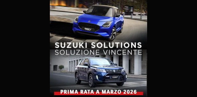 **IPT, PFU ed eventuali spese di rottamazione esclusi - presso i concessionari aderenti. La valutazione di eventuali vetture in permuta sarà effettuata in sede di sottoscrizione del contratto. Prezzo promo chiavi in mano calcolato con: incentivo Suzuki. L’offerta è applicabile per tutti i contratti stipulati dal 01/03/2026 al 31/03/2026 salvo esaurimento fondi. Verfica le promozioni di ogni singolo modello sul sito Suzuki.it . Verifica sempre sui siti ufficiali delle autorità competenti la disponibilità dei fondi e il possesso dei requisiti per accedervi.