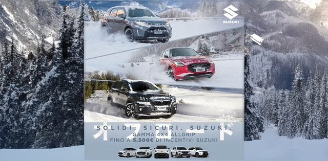 *IPT, PFU ed eventuali spese di rottamazione esclusi - presso i concessionari aderenti. La valutazione di eventuali vetture in permuta sarà effettuata in sede di sottoscrizione del contratto. Prezzo promo chiavi in mano calcolato con: incentivo Suzuki. L’offerta è applicabile per tutti i contratti stipulati dal 01/03/2026 al 31/03/2026. Verfica le promozioni di ogni singolo modello sul sito Suzuki.it . Verifica sempre sui siti ufficiali delle autorità competenti la disponibilità dei fondi e il possesso dei requisiti per accedervi.